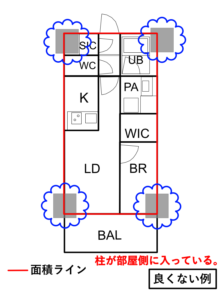 専有面積は壁芯と柱芯をむすんだラインになっております。部屋側に柱型が出てくると使えない部分にお金を払っていることになるので選ぶのを避けたほうが良いです。とはいえ、完全に柱が入っていない間取りは少ないので、選ぶ順番としてはバルコニー側は柱が部屋側に入っていない、玄関側は柱が入っているくらいで選んでいくようにしましょう。