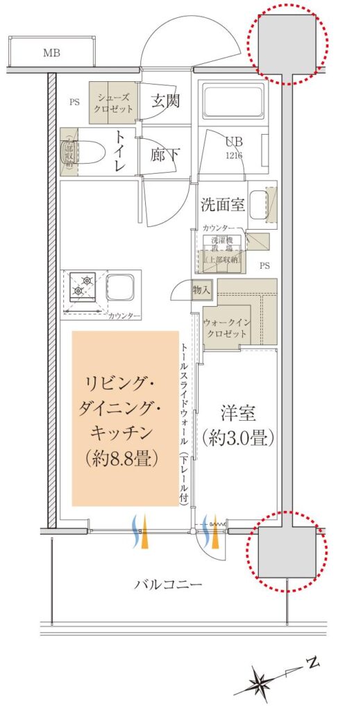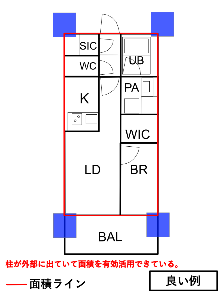 - 壁式構造となっているので柱・梁がなく面積ロスがない。