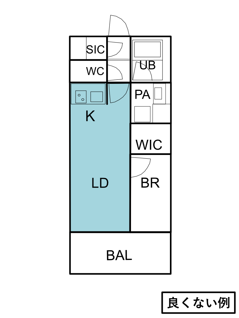 - リビング・ダイニング・キッチンが縦長になっており家具配置に制限が出ている。
