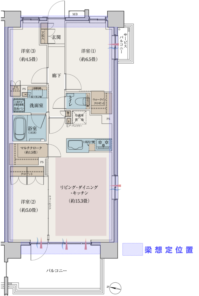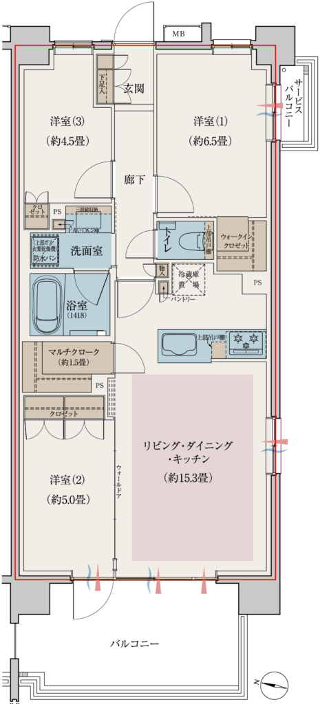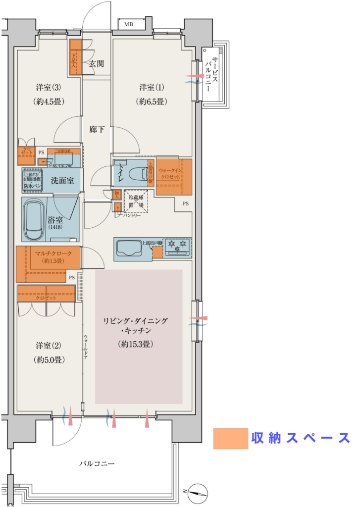 収納についてはマルチクロークを筆頭に洋室(1)にWICがあります。洋室(2)の幅広い収納も見逃せません。洗濯機置き場の吊戸収納はありませんが、乾燥機を設置できるので前向きに捉えましょう。