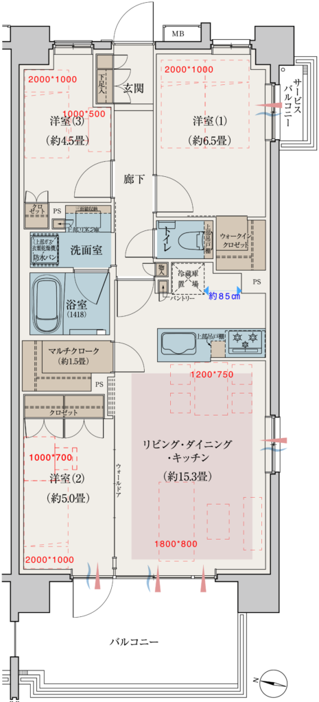 家具配置については洋室(2)のデスクサイズに注意する点と、キッチンの食器棚置き場の幅が約85㎝となっている点です。
