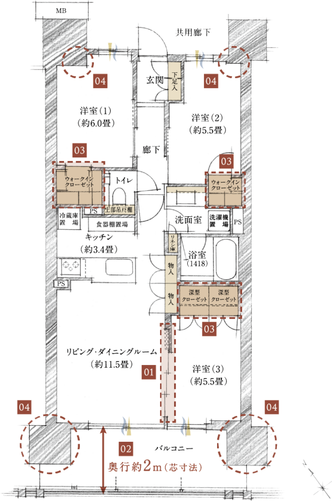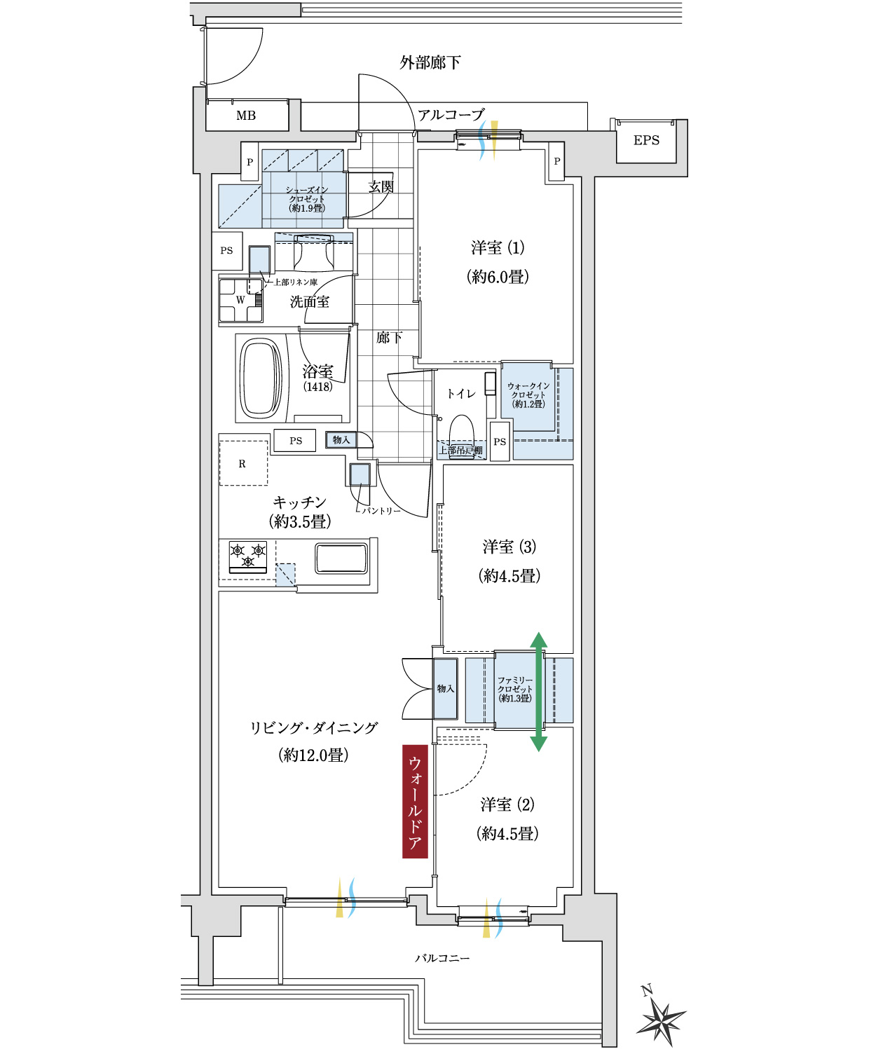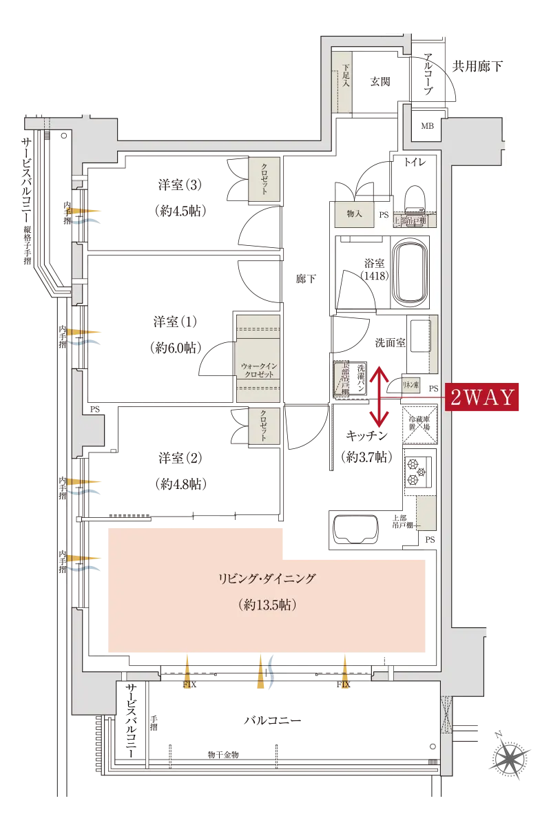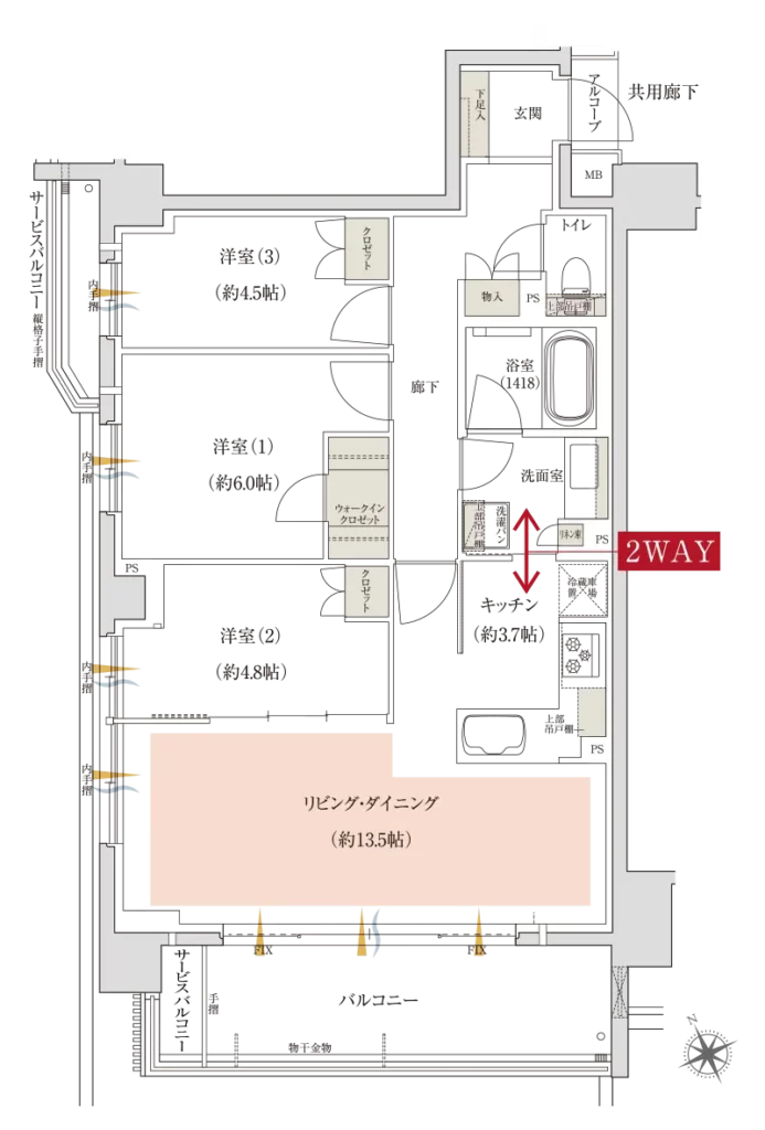 デメリットとしては洋室3が行燈部屋(窓がない部屋)となっております。メリットとしては居室を縦に並べることによってファミリークローゼットを設置して収納の使い勝手に幅が出ております。また、最近の田の字プランでは洗面がLDアクセスになることが多いのですが、廊下からのアクセスとなっており家族間でのプライバシー性も上がっております。また、廊下がタイル貼りとなっており仕様が高くなっている点も良いと思います。居室部分の扉が基本的に引き戸を採用しているので空間を有効活用できております。バルコニー形状が法的な関係か?凹凸がついており使い勝手に制限が出てきております。