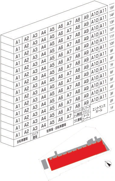 - A1タイプは共用廊下の突き当たりに位置しており、廊下部分が広く設定されております。