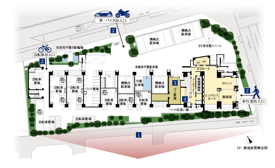 24時間ゴミ出し可能なゴミ置場、EV充電車スペースや来客車用駐車場も完備されております。