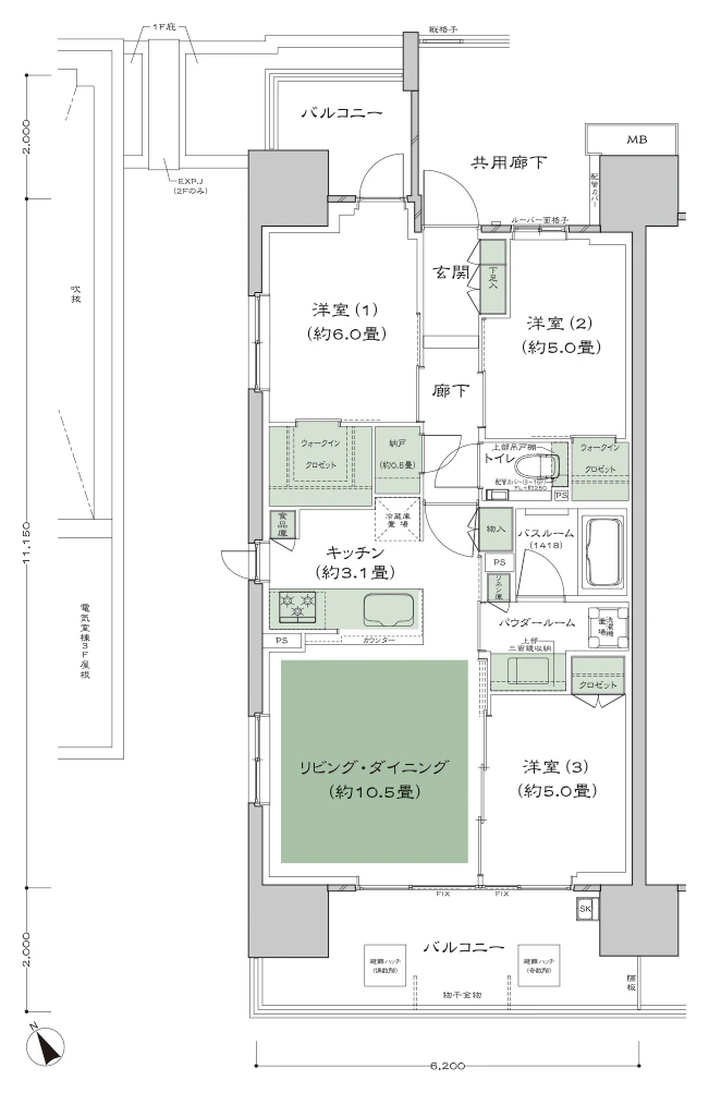 - バルコニー、廊下側とも柱が外に出ているので有効率が上がっており、部屋の使い勝手が良いです。