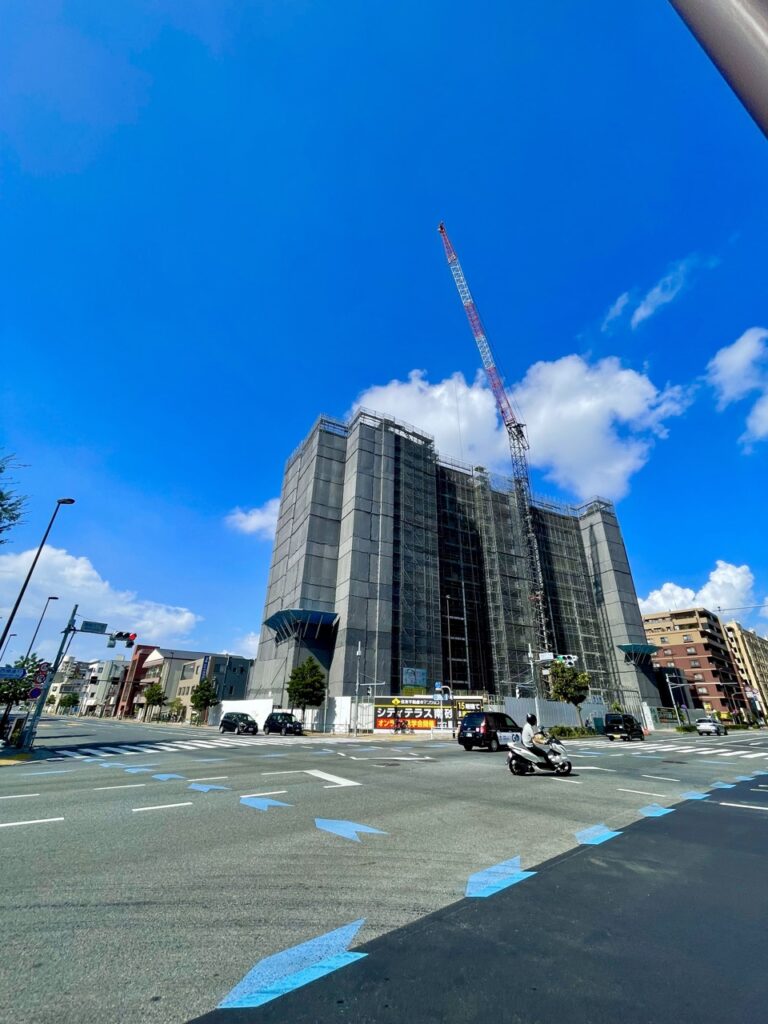 交差点にから見えるシティテラス南砂。存在感ありますね!敷地の南側は低層な街が広がっているので竣工すると
