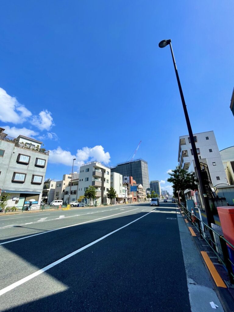 敷地南側からの写真です。道路の広さにゆとりを感じます。この道路幅は西側の世田谷区とはまた違った良い点だと