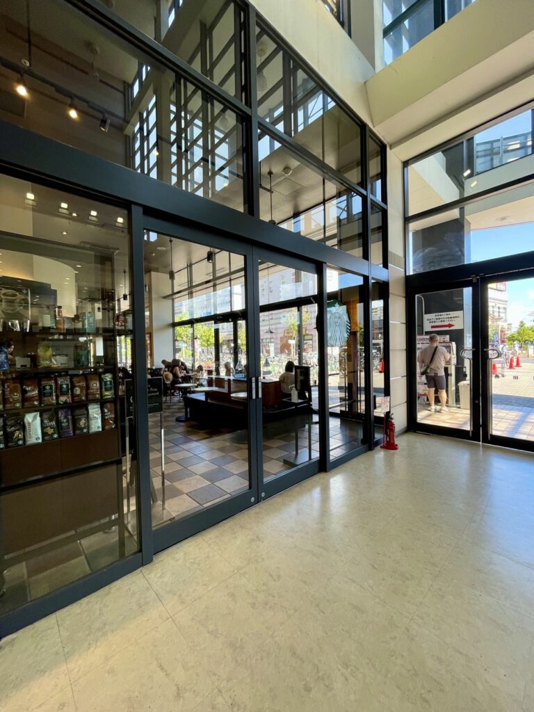 スターバックスの入り口です。午前中に訪れましたがいい雰囲気でした。都心のお店よりも広くゆとりを感じました。