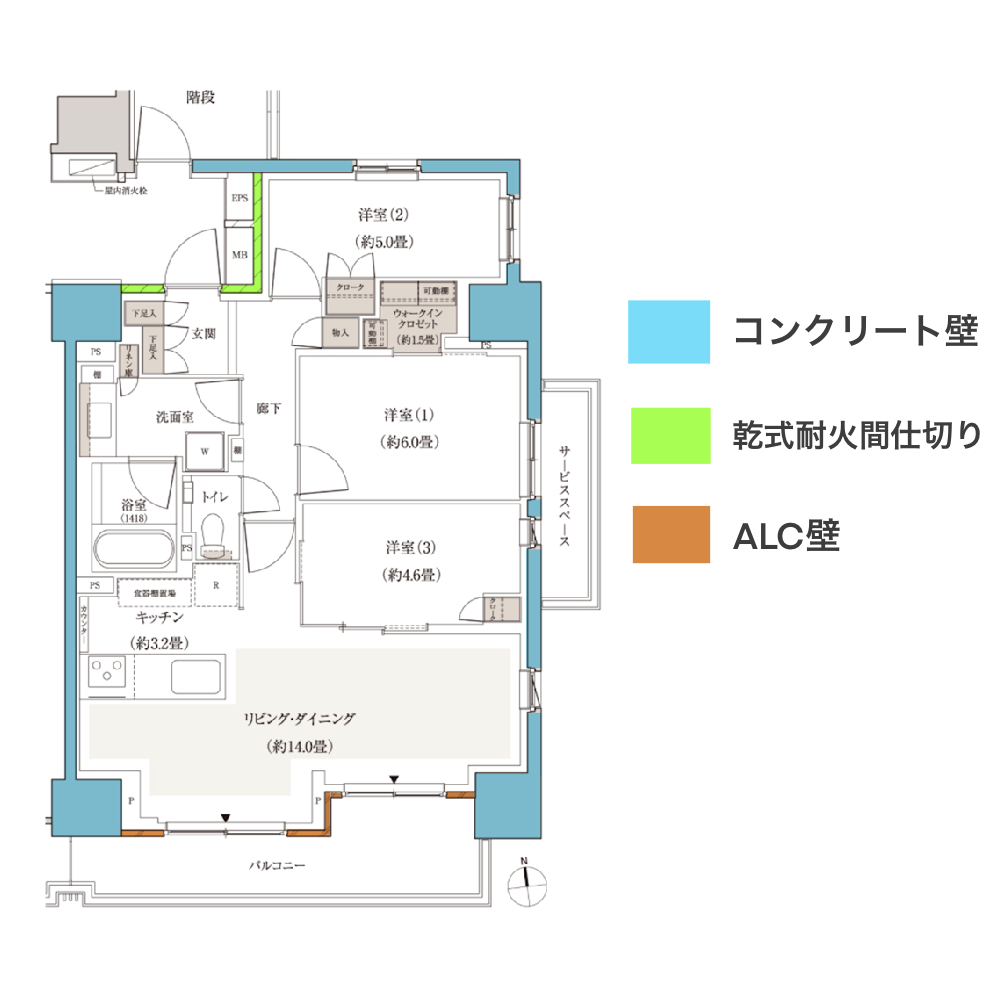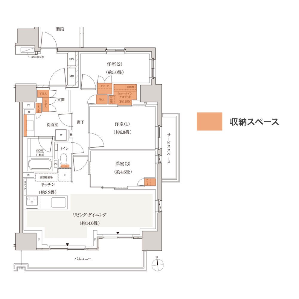 収納については洋室(1)にWICがあり可動棚になっているため、使い勝手が向上しております。共用物入の大きさも十分に確保されています。