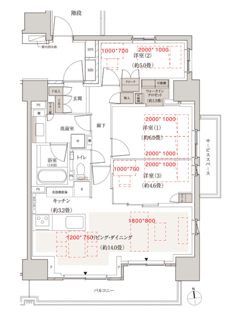 家具配置はこんなイメージになるよ。ダイニングテーブルのサイズと位置は